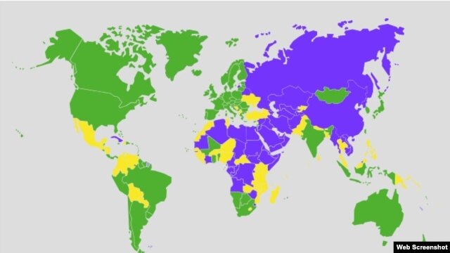 نقشه فریدام هاوس از آزادی که در آن کشورهای غیر آزاد با رنگ بنفش، نسبتا آزاد با رنگ زرد و آزاد با رنگ سبز مشخص شدهاند.